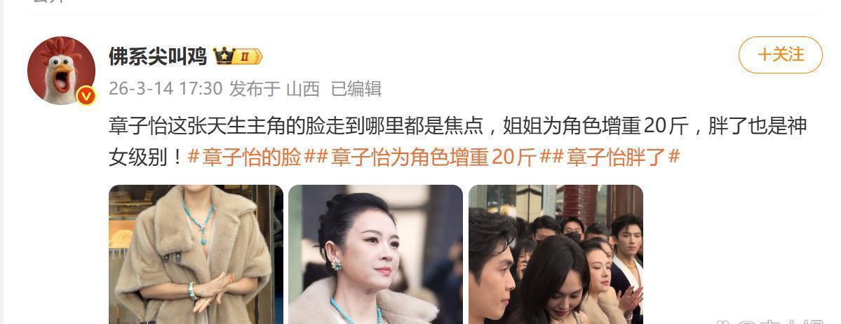 乍一看变化确实不小,有网友搬出了“最强解释”:为新角色敬业增重!据多名博主和粉丝透露,章子怡为即将在4月开拍的新电影角色,主动增重了20斤,这才导致了面部轮廓的暂时改变。支持者们力挺,认为动态镜头里的她骨相优势依旧,圆润反而带来了健康柔和的美感,完美呼应了其“戏大于天”的敬业传统。不过,有些网友也有质疑,这“浮肿感”更像是填充类医美项目后未完全恢复的状态,当然,这种说法目前没有任何官方证实,业内也有观点指出,单次活动的生图极易受到现场死亡灯光和诡异角度的影响,未必能反映真实状态。