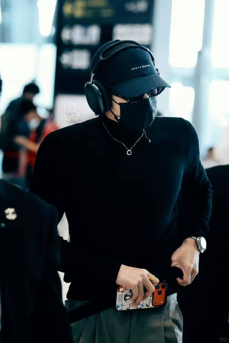 当天他穿了一件黑色紧身高领毛衣,搭配一条棕色垂顺长裤,头上戴一顶棒球帽,脸上架着墨镜,还戴了口罩,把大半张脸都遮住了。
